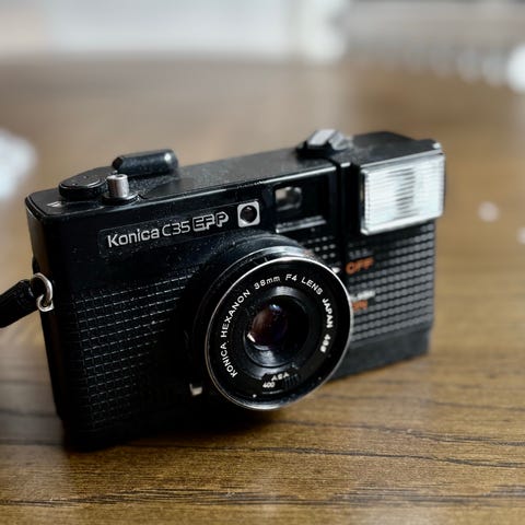 Konica Big Mini DF-Finder analogt kompaktkamera i sort. Kameraet er et 35 mm filmkamera med indbygget blitz og fast objektiv.