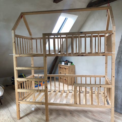Vi har købt den af en tømre som selv har bygget den, og man kan godt se den er hjemmelavet på skruer osv ( se billeder).