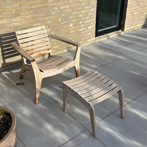 Skagerak Skagen havemøbelsæt i teaktræ. Rektangulært bord, bænk og to stole med armlæn. Træet fremstår patineret og trænger til at blive slebet. Ny pris 20.000 kr.