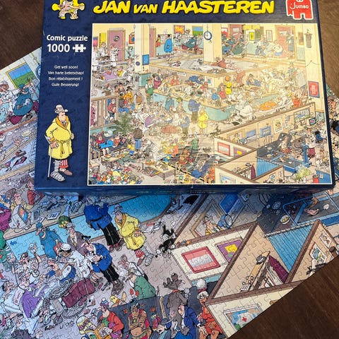 Jumbo Jan van Haasteren The Art Market puslespil med 1000 brikker. Motivet er en humoristisk tegneserieillustration af et kunstmarked med mange figurer og detaljer.