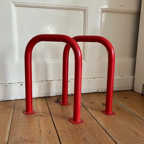 2 stk. ens solide hyldeknægte, udført som rørbøjler i hvid-lakeret metal. Brugsspor medfølger.