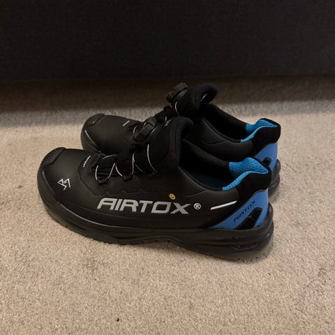 Airtox sikkerhedssko i sort. Skoene har lukket snudesektion og forstærket tåområde. De er udstyret med drejespænde/snurresystem til lukning og har polstret hælkappe og krave for øget komfort. Ydersålen er profileret for bedre greb. Velegnet som arbejdssko eller sikkerhedssko i miljøer, hvor der er behov for ekstra beskyttelse af fødderne.