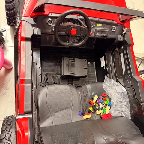 XL elbil til børn, 24V, elektrisk bil, offroad med rigtig affjedring. Den er lavet om til at køre på Dewalt batterier, adaptere kan udskiftes så den kan køre på Makita eller lignende.
