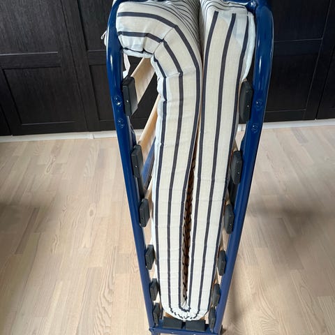 IKEA sammenklappelig gæsteseng med lamelbund og madras. Sengen har en blå metalramme og trælameller. Sengen kan foldes sammen, så den fylder minimalt ved opbevaring!
