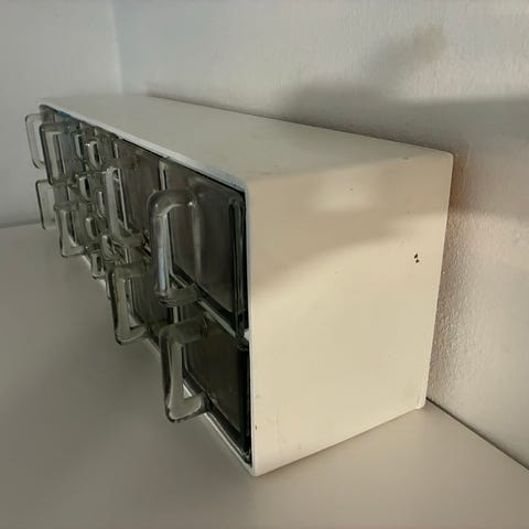 Ilva Karaca bestikskrin i træ med glaslåg og tre skuffer. Skrinet har udtagelige indsatsbakker i lys plast med ruminddeling til knive, gafler, skeer og serveringsdele. Overdelen har gennemsigtigt glas, så indholdet kan ses ovenfra. Egnet til opbevaring og organisering af bestik i køkken eller spisestue. 25cm høj og 50 cc bred og 38 cm dyb flot i stand glasset er flot så der kan man også være mange ting man kan tage skufferne ud og lave noget eller man kan ja og nogle andre skuffer i hvis til opbevaring af af knive eller ja som et glas monster. Man er meget velkommen til at se på det her opbevaring til knive og glas og man kan lave lidt med hvad som helst med det glas opbevarings med skuffer men igen kom og se på det hvor flot det er