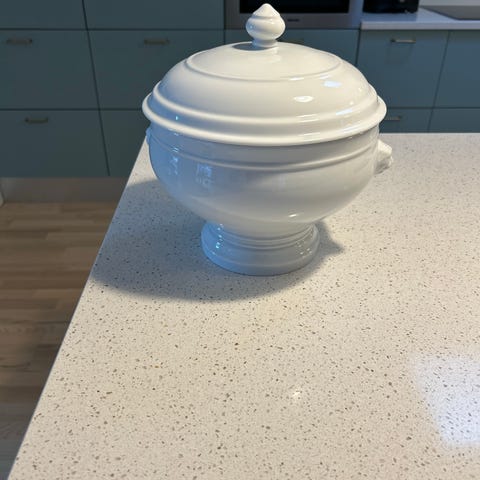 Porcelæn, Suppeterrin, Pillivuyt, Hvid suppeterrin i porcelæn med låg. Med “ører” formet som løvehoveder. Kun let brugt og fremstår meget fin. Ingen defekter. Sælges da jeg ikke får den brugt. Tåler: Opvaskemaskine Fryser Ovn Microbølgeovn Måler: Ø: 22,5 cm Rumindhold: 3,15 liter