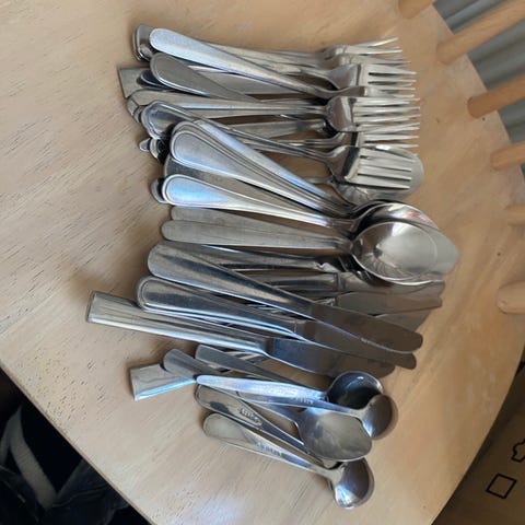 Cutlery set, pots, kitchen wear, plates, glasses,