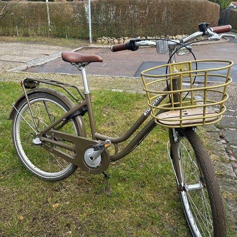 Norden 24" børnecykel i gul med lav indstigning. Cyklen har 24" hjul, fastmonteret frontkurv og bagagebærer. Udstyret med kædeskærm, skærme for og bag samt brune sadel og håndtag. Velegnet som hverdagscykel til større børn med oprejst kørestilling.