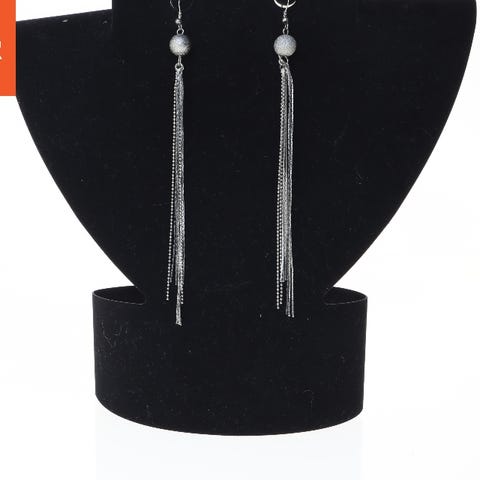 Et sæt moderne lange øreringe med flere sammenhængende tynde kæder, der giver et kaskade-agtigt look. Øreringenes metal er sølvfarvet og har en skinnende finish.