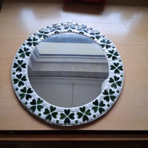 Rund dekorativt spejl med keramik mosaikramme (str. Ø 22 cm)