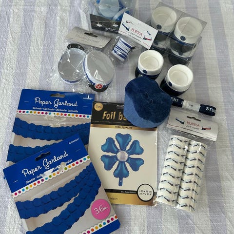Pakke med plastik HFstudenterhuer på pinde og flag. to pakker forskellige servietter med ca 15 stk i hver pakke. Beregnet til pynt eller dekoration, muligvis til en festlig begivenhed som en studentereksamen.