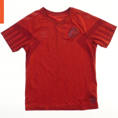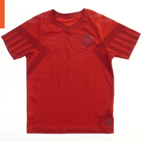 Fodboldtrøje med kort ærme i rødt og hvidt. Trøjen har et logo på forsiden, som tilhører Dansk Boldspil-Union, samt Hummels logo. Der er et mønster, der ligner lydbølger på trøjen. Ærmerne har et chevron-design.