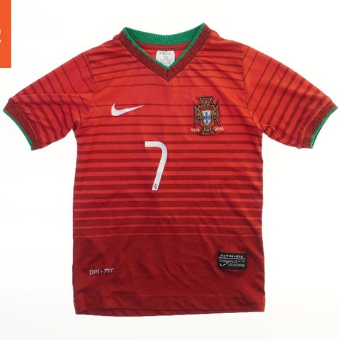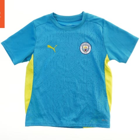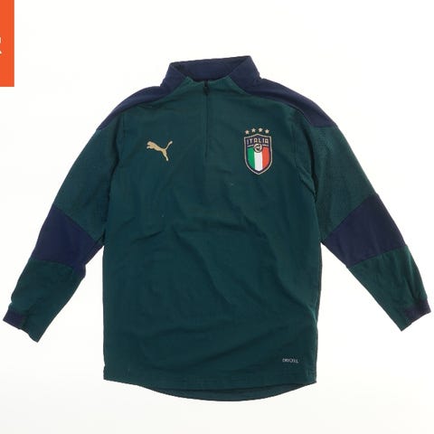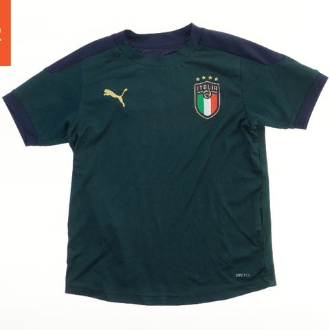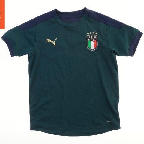 Blå fodboldtrøje med korte ærmer og Italiens logo. Trøjen er af mærket Puma og har hvide Puma-logoer på skuldrene og brystet. Italiens flag er også synligt på ryggen.