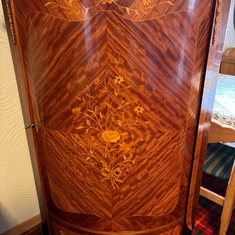 Italiensk fremstillet hjørneskab med fem glasreoler, mål 80 × 40 × 183 cm, lavet af bambus, rotting og glas, dateret til 1950–1960, i god brugt stand med mindre aldersmærker og pletter og nogle fejl i den bageste flettede. Klik på den blå "gå til varen" knap, for at købe eller byde på denne vare. Den samlede pris vil blive vist inden du afgiver dit bud.