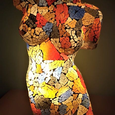 Lampe i glaspasta i farverne orange og blå med sit lampeskærm, der har jernperler. Foden på denne lampe lyser også, så der er altså to lyskilder