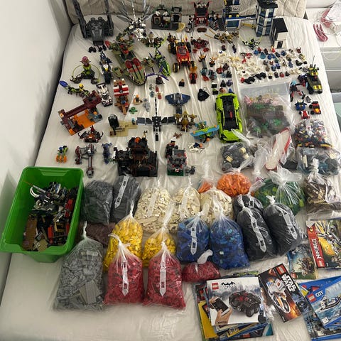 Lego-parti på cirka 12 kg. Star Wars, Technic, City, Ninjago, både osv. Inklusive byggeplade (to, men én er brækket). Ingen garanti for komplethed og ingen minifigurer. Afsendes med PostNL.