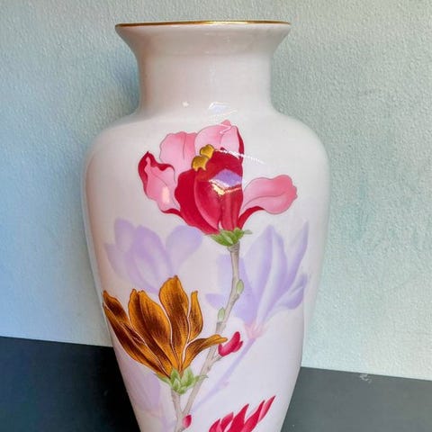 Denne vidunderlige, elegante vase af porcelæn prydes af et kunstfældigt håndmalet dekor i en kraftig majsgul farve. I dekoret kan vi se en lykkebringende drage og flere interessante objekter. Gyldne skinnende håndtag! Et objekt som er værd at samle på! Vasen har fået en let patina, hvilket gør den endnu mere kostbar. Farverne kan variere en smule afhængigt af belysning og skærm.