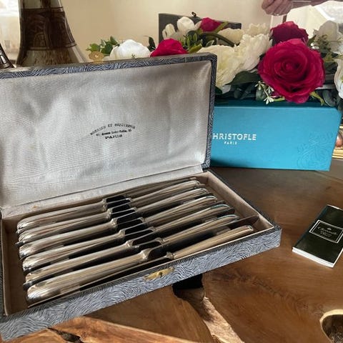 Et sæt på 12 desserknive til entremets fra Christofle, model Coquille Vendôme Arcantia i sølvbelagt metal.
