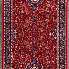 Smukt maskinvævet tæppe i traditionel Keshan-stil, kendet af et rigt detaljeret centralt medaillon og en elegant blomsterdekoration. Den varme røde farve i kombination med elfenbenshvid og mørkeblå accenter giver et tidløst og eksklusivt udtryk.