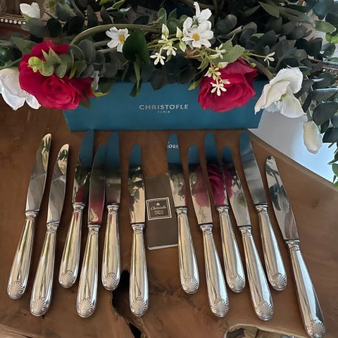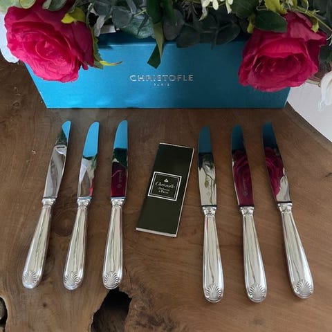 Sæt af 12 spiseknive Christofle model Versailles i sølvbelagt metal.