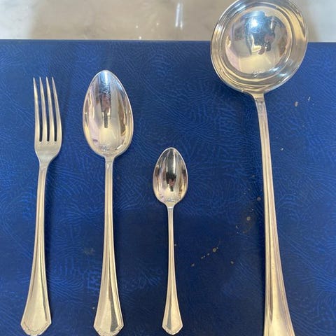 Denne raffinerede franske bordservice afspejler den afdæmpede sofistikation i midt-20. århundredes håndværk og forener rene linjer med et tidløst, alsidigt design, der passer til både klassiske og moderne indretninger.