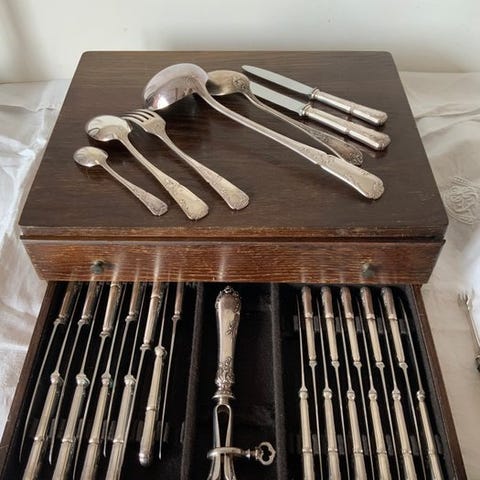 Et elegant og komplet sølvbelagt bestiksæt af H. Périer, juveler i Nîmes (Frankrig), præsenteret i sin originale tilpassede etui.