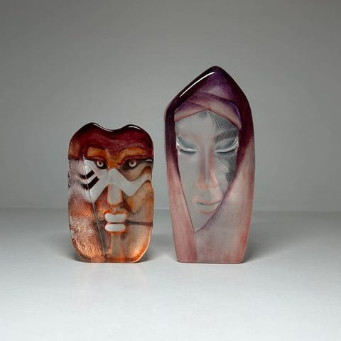 Sæt af 2 signeret glas-skulpturer af Mats Jonasson til Målerås i Sverige; den største ca. 14 cm høj og den mindre ca. 6,5 cm, begge i god vintage stand med mindre slid. Klik på den blå "gå til varen" knap, for at købe eller byde på denne vare. Den samlede pris vil blive vist inden du afgiver dit bud.