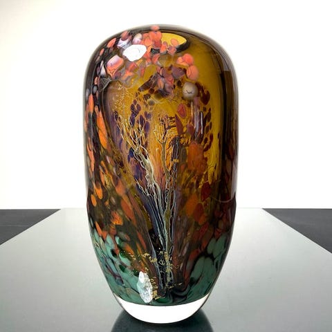 Dekor med en baggrundsboble blæst i gennemsigtigt ravfarvet glas, opaline farver og nedtoninger i glassets masse i bevægelse.
