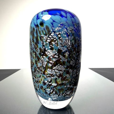 Unik glasvase af den franske kunstner Maxence Parot, 17 cm høj og 9 cm i diameter, lavet af glas, signeret og dateret 2026, med 24 karat guldblad og amber opalan dekor, i fremragende stand. Klik på den blå "gå til varen" knap, for at købe eller byde på denne vare. Den samlede pris vil blive vist inden du afgiver dit bud.