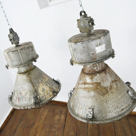 Vi tilbyder to undervands-ubådslignende industrielle vintagelamper med naturlig patina fra 1970'erne.