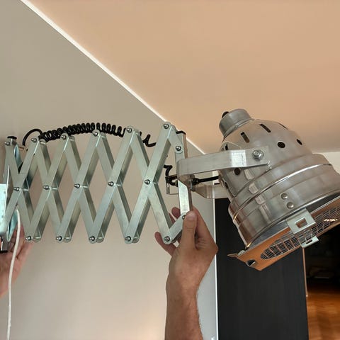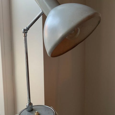 Imponerende lot på 3 industrielle lamper fra 50'erne (Luminor Torino) i generelt gode stand, minimale tegn på tid, fuldt funktionelle, ledninger originale, der er foretaget konservativ restaurering (rense, polering, genskabe glansen i kromerne og den ikoniske grønne hammerede farve, typisk for industri lamper fra den periode), bevidst bevaret nogle af tidens tegn, som absolut bekræfter originaliteten, kompasp-lampen har en maksimal rækkevidde på 90 cm, diameteren på loftslampen er 35 cm, bordlampen med klemme har en rækkevidde på 50 cm, alle tre stammer fra den samme