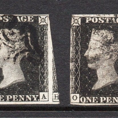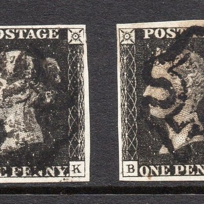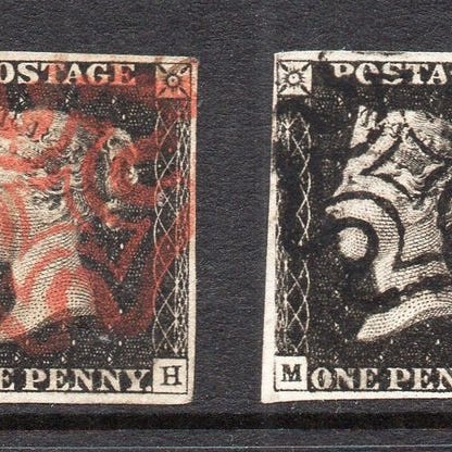 Oprindelse Storbritannien; GB QV SG2 1840 1d Penny Black Plate 3 Horizontal Pair, brugt, meget fin med næsten fire marginer og sorte MX-sletninger. Klik på den blå "gå til varen" knap, for at købe eller byde på denne vare. Den samlede pris vil blive vist inden du afgiver dit bud.