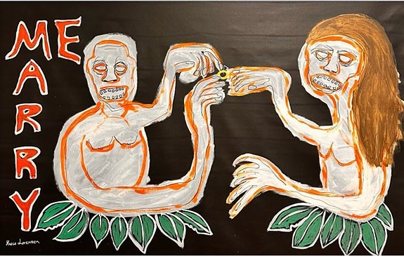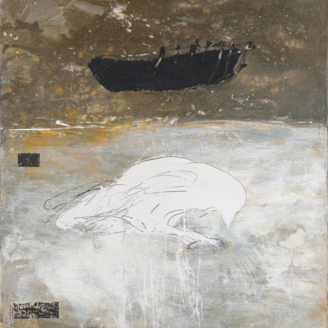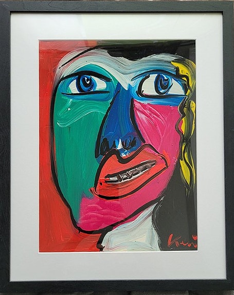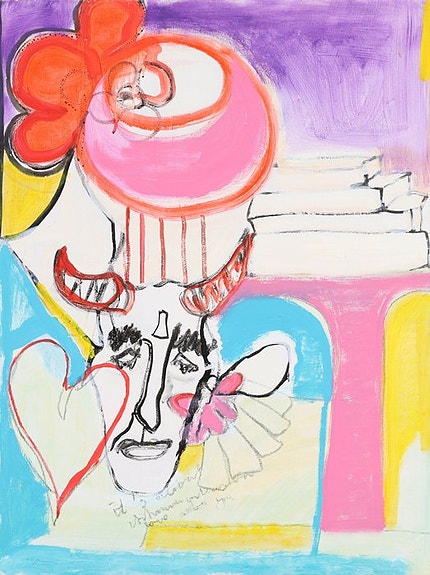 Acryl, filtpensel og farveblyant på fast vellin med lærredslignende effekt, 24 x 17 cm, verso signeret og dateret "20.VII.98". I passepartout (50,6 x 42,5 cm) an der Blattoberkante zweifach montiert.