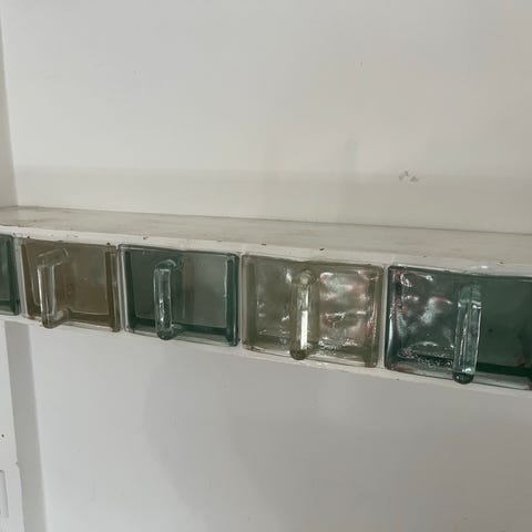 Fin køkken hylde fra Ib Laursen, med 4 glas skuffer til opbevaring og stang til at hænge noget på. Glas skufferne er intakte og uden skår. Hylden har patina, men kan males, hvis man ønsker det.