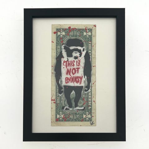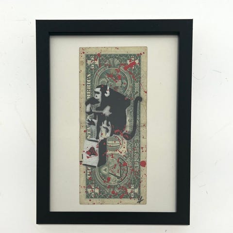 Fortryllende penge / dollars-kunst skabt af den populære WhyCreationz. Ved brug af mixed media-teknikker som stencil og akrylmaling har kunstneren skabt graffiti-street Scrooge på en dollarseddel. Færdiggjort til perfektion, er dette et superb samlerstykke eller gave.