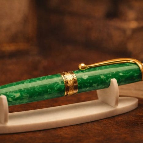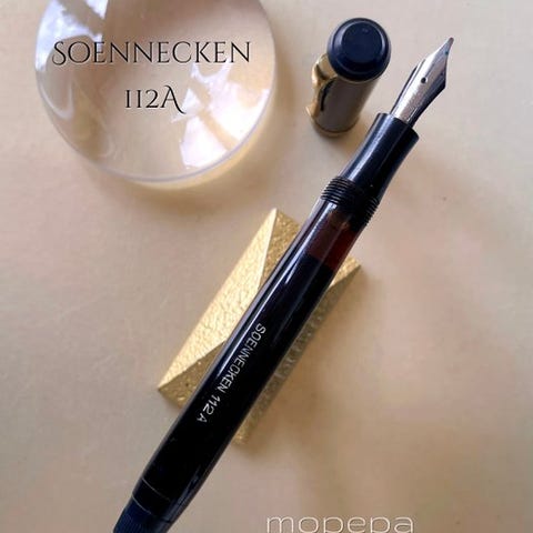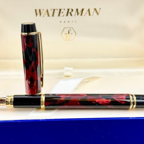 Kroppen og hætten, udformet i marmoreret rød celluloid, fremviser en dyb og tiltrækkende glans med veldefinerede åretegninger og uden synlige misfarvninger. Der ses lette overfladerydder og tegn på brug i forhold til alderen, synlige kun ved tæt inspektion, uden revner, sprækker eller reparationer. Celuloiden er stadig strukturel sund.