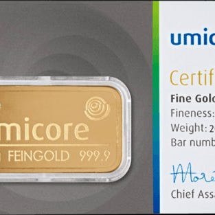 Gullbarre på 20 g med en renhed på .999, fremstillet af Umicore og LBMA-certificeret, forseglet i blister/plexikapsel og kommer fra Belgien. Klik på den blå "gå til varen" knap, for at købe eller byde på denne vare. Den samlede pris vil blive vist inden du afgiver dit bud.