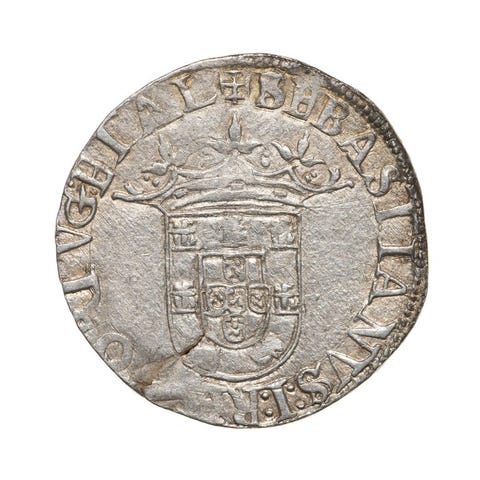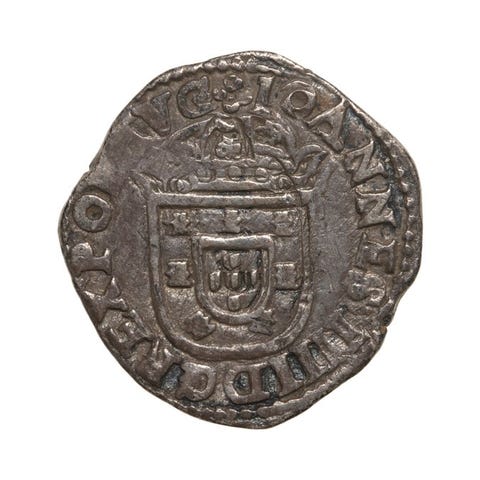 Portugal sølv Vintém (20 Réais) præget i Lisabon, PORTVGALI / G : N : - Coroa c/Arruelas - Não Classificada, præget under D. João III (1521–1557); vægt 1,80 g, diameter 17,90 mm, stand VF/VF+. Klik på den blå "gå til varen" knap, for at købe eller byde på denne vare. Den samlede pris vil blive vist inden du afgiver dit bud.