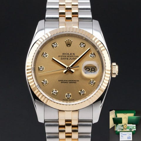 Rolex Datejust 116233, årgang 2004, Unisex automatisk ur med en 36 mm guldfarvet/stål kasse, sølvfarvet skive og guldfarvet/stål lænke, inklusive original boks og papirer, original garanti ikke inkluderet, i meget god stand med mindre brugsspor. Klik på den blå "gå til varen" knap, for at købe eller byde på denne vare. Den samlede pris vil blive vist inden du afgiver dit bud.