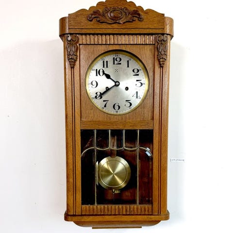 Vintage Junghans vægur i træétui med udskåret øverste del, rund skive med sorte arabiske tal, mekanisk otto-dages urværk, slag hver halve time på en gong, fra 1930–1940 og tysk fremstillet; i god brugt stand og i funktion. Klik på den blå "gå til varen" knap, for at købe eller byde på denne vare. Den samlede pris vil blive vist inden du afgiver dit bud.