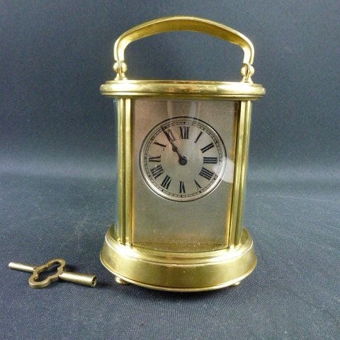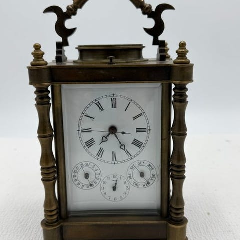 Rejseur i forgyldt messing med glaskasse og emailleskiver, mekanisk 8-dages urværk, uden slag, to」という optrukne nøgler, dateret 1960–1970 og fremstillet i Frankrig, med én side med romerske tal og den anden side temperatur og hygrometer, i god brugt stand med mindre aldersspor, målene 16 × 20 × 8 cm, vægt 2,5 kg. Klik på den blå "gå til varen" knap, for at købe eller byde på denne vare. Den samlede pris vil blive vist inden du afgiver dit bud.
