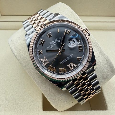 Tilgængelig nu er denne helt nye og ubrugt Rolex Datejust 36, reference 126200, med en stålramme og Jubilee-lænke for et tidløst og elegant udtryk.