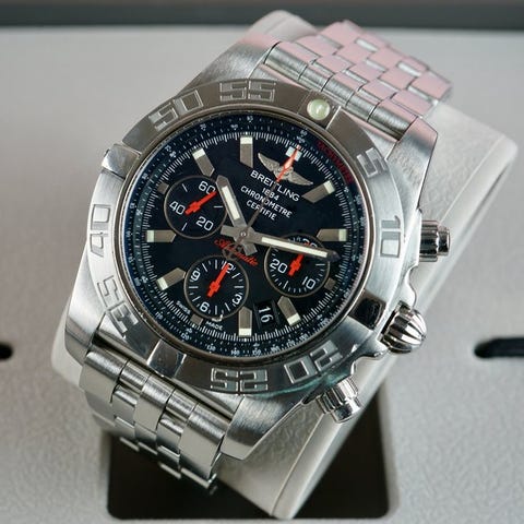 Meget flot Breitling Chronomat 44 Blacksteel med det interne B01-chronografværk. I god stand, virker godt. Nogle lette tegn på brug, ikke noget alvorligt. Gummiremmen passer til et håndled med en diameter på 19 cm. Kassen er 44 mm i diameter uden krone.
