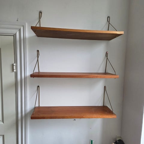 Massive teak hylder med messing bøjler - Kan sendes, men ikke med FIKS