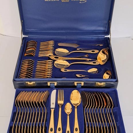 Servisk til 12 personer – Rustfrit stål 18/10 og guld detaljer – Mitteleuropæisk produktion “Rostfrei” – 62 stykker