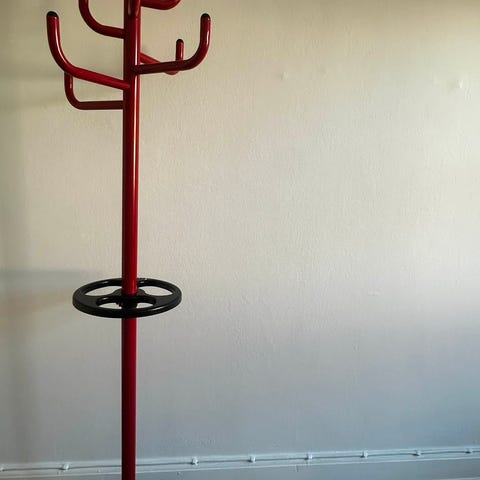 I sortmalet træ med røde detaljer på paraplyholder og knager