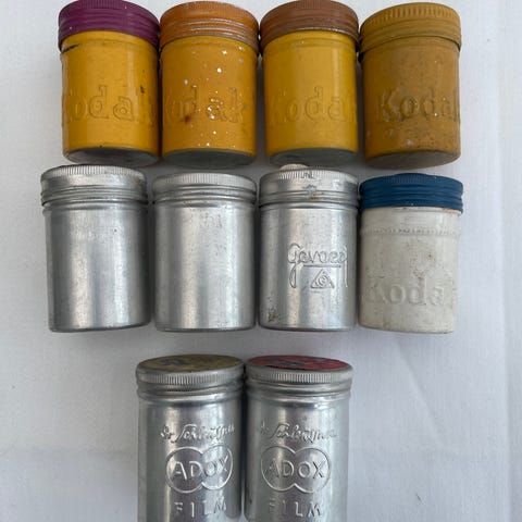 runde 35mm Kodak filmdåser/-æsker metal. Film box fire stk. Diam. 18cm, højde 4cm. Kan bruges til dekorativ opbevaring eller dekoration til filminteresserede.