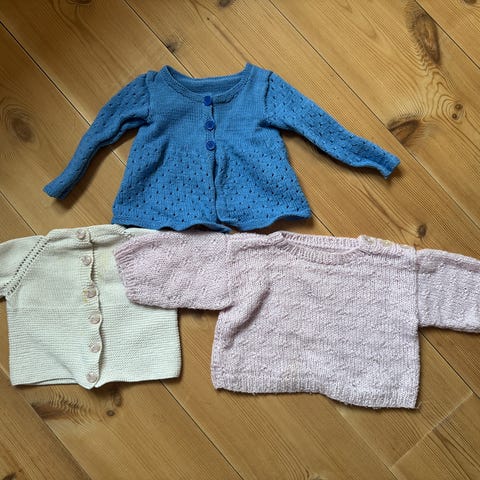 5 cardigans til pige i str. 80 i forskellige nuancer. Sættet består af cardigans fra forskellige mærker som H&M og Tape a loeil. Der indgår blandt andet en rosa cardigan med knapper, en quiltet cardigan med trykknapper, en langærmet cardigan med hjerte foran samt en cardigan med kaninprint. Materialet er primært bomuld, som er blødt og egnet til hverdagsbrug for små børn.