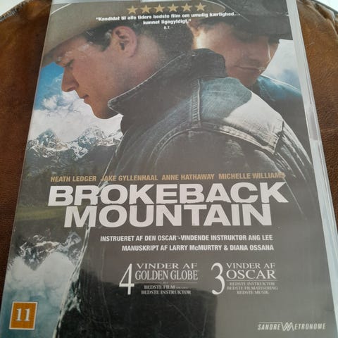Brokeback Mountain dvd film. Forsiden viser filmens originale plakatmotiv med de to hovedpersoner. Filmen er en prisvindende spillefilm, og udgaven er på dvd. Velegnet til afspilning på dvd-afspillere, computere med dvd-drev eller lignende udstyr, der understøtter dvd-formatet.