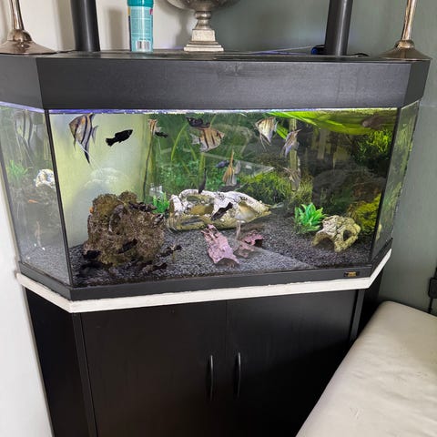 Vi har mistet interessen og sælger derfor vores 2 hjørneakvarier på 190 l. Du får alt med men skal selv hjælpe med at tømme . Der er to store pumper med som fungerer perfekt.